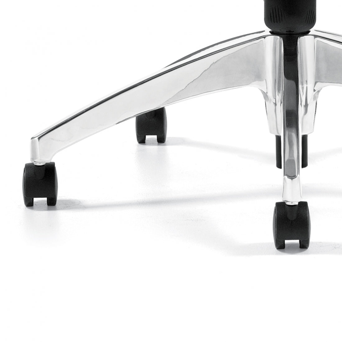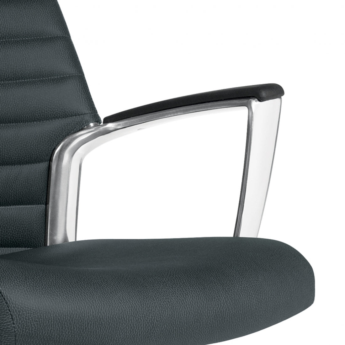 Global Accord features a polished aluminum arm with a sling style back, upholstered with rolled and pleated details, and is available in an array of fabrics, vinyls or leathers.